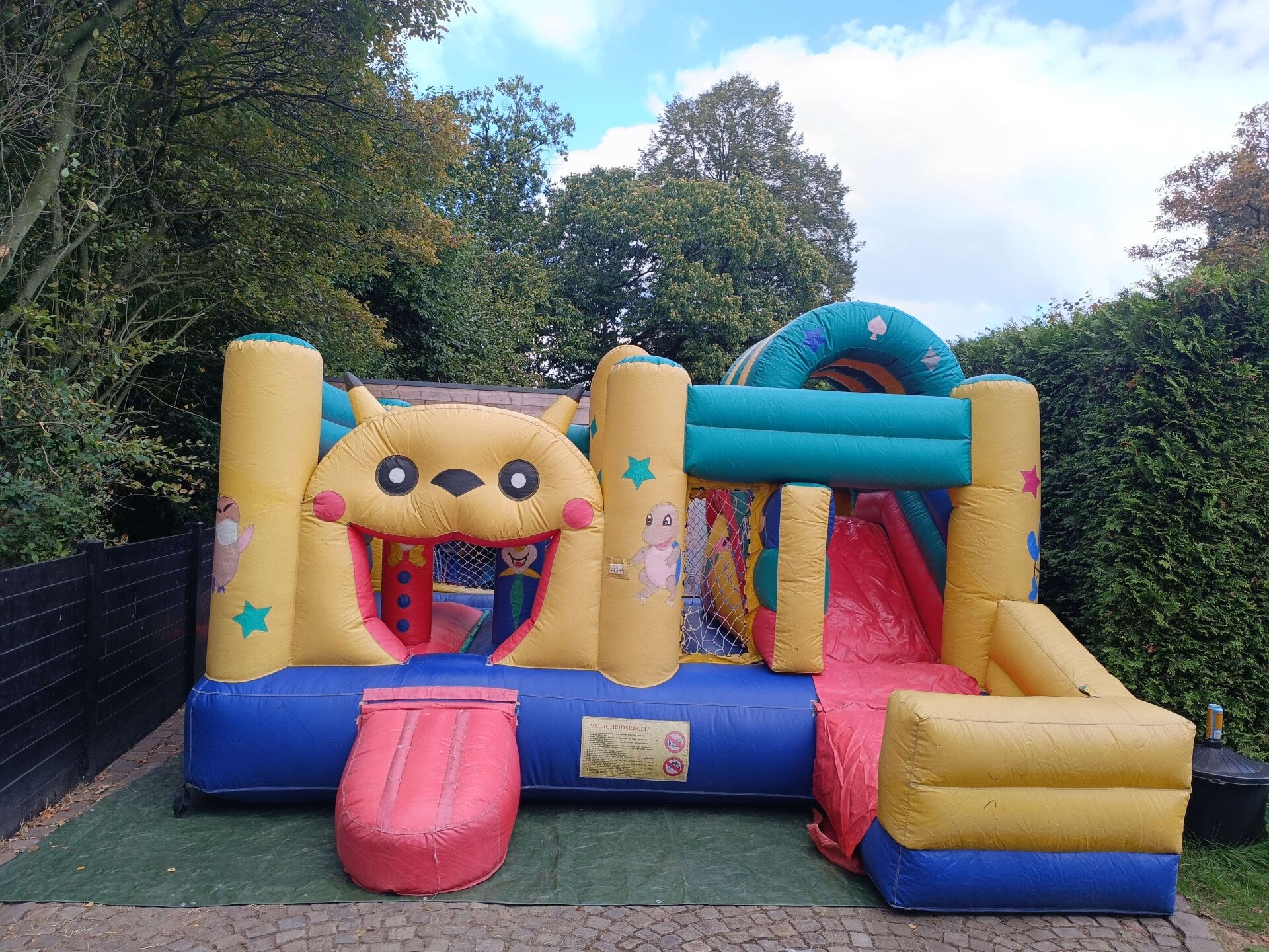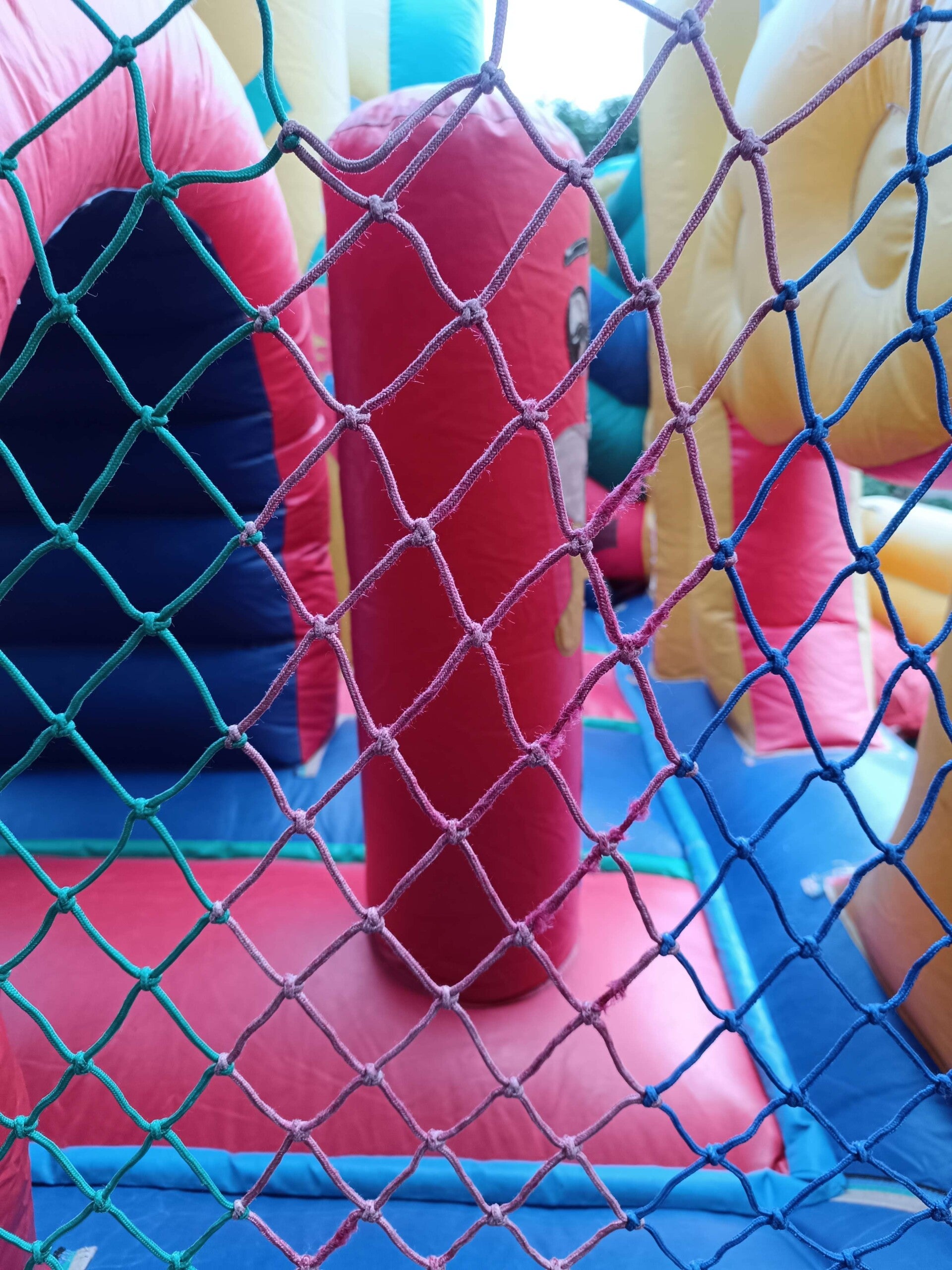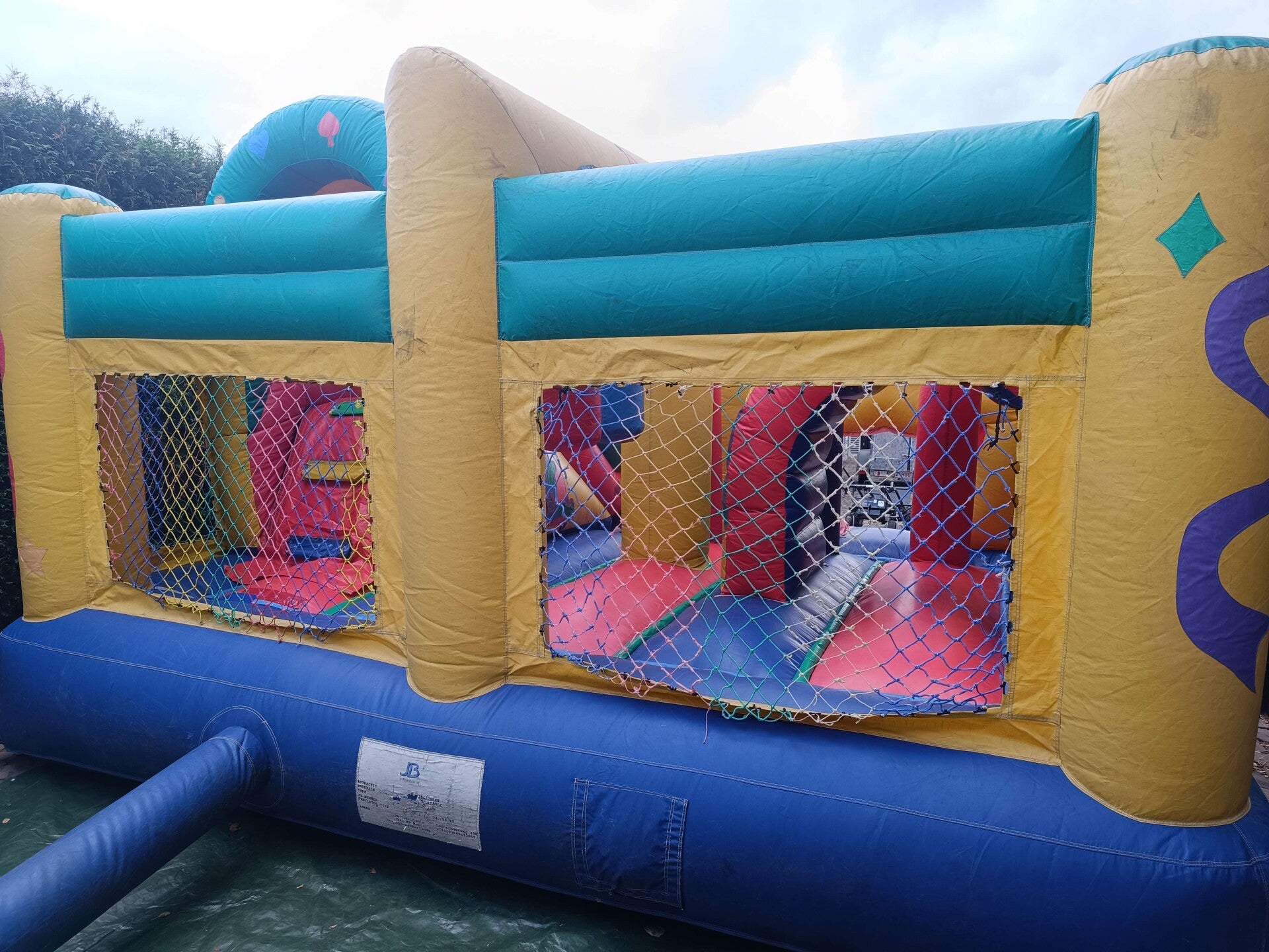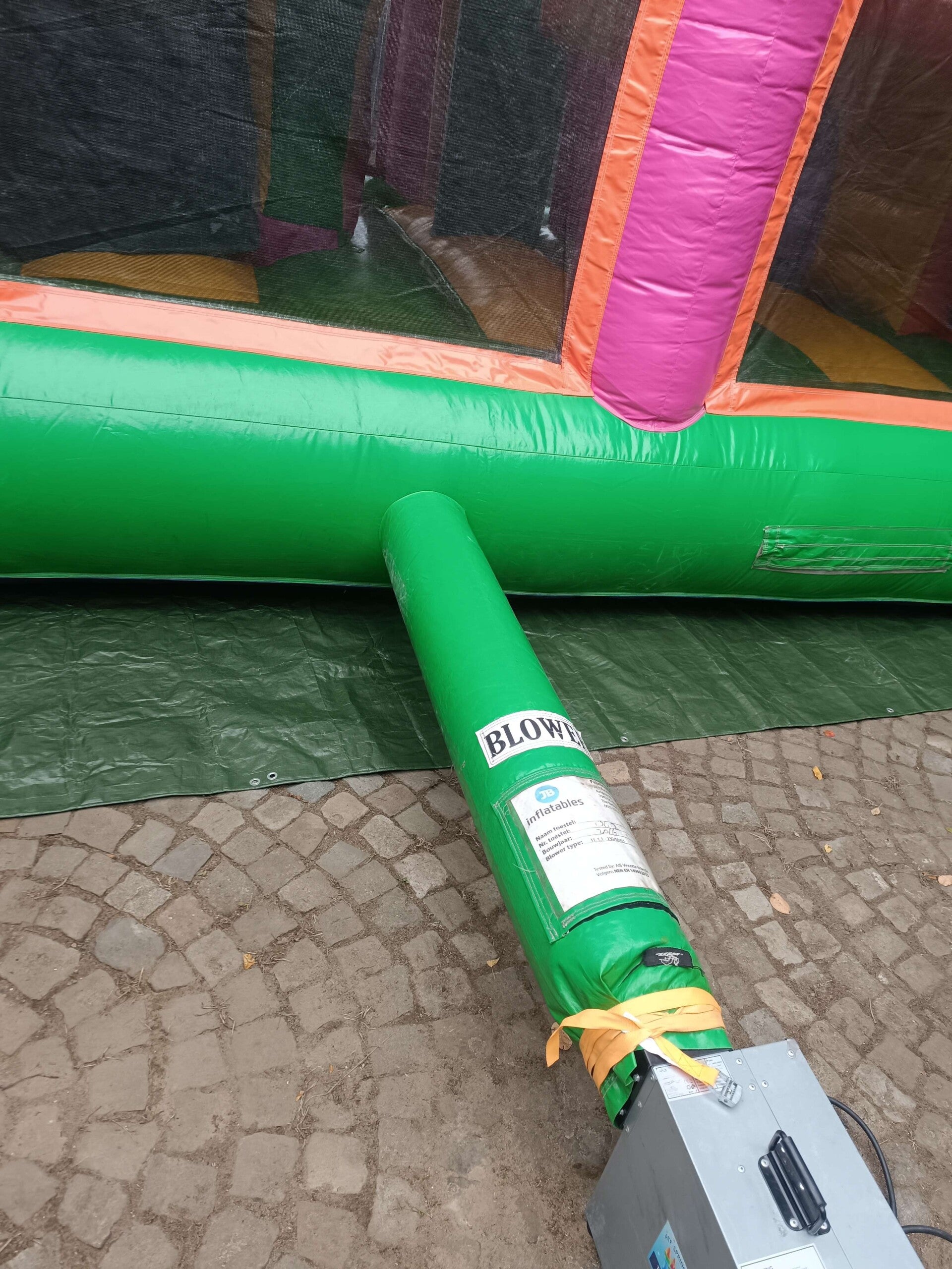 Dit Multiplay springkasteel heeft al aardig wat jaartjes meegemaakt. . Hij blaast niet meer zo hard op als hij zou moeten. Wel heb ik de vangnetten allemaal terug op orde gebracht, en zullen kleine kinderen geen last ondervangen van de opblaaskracht.