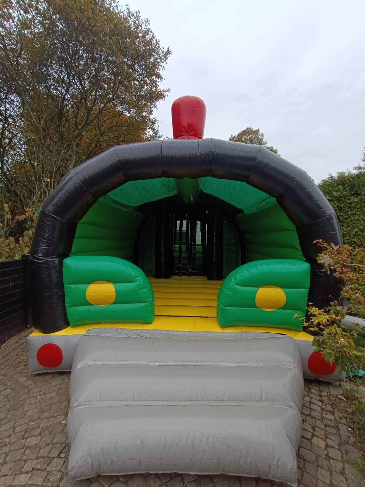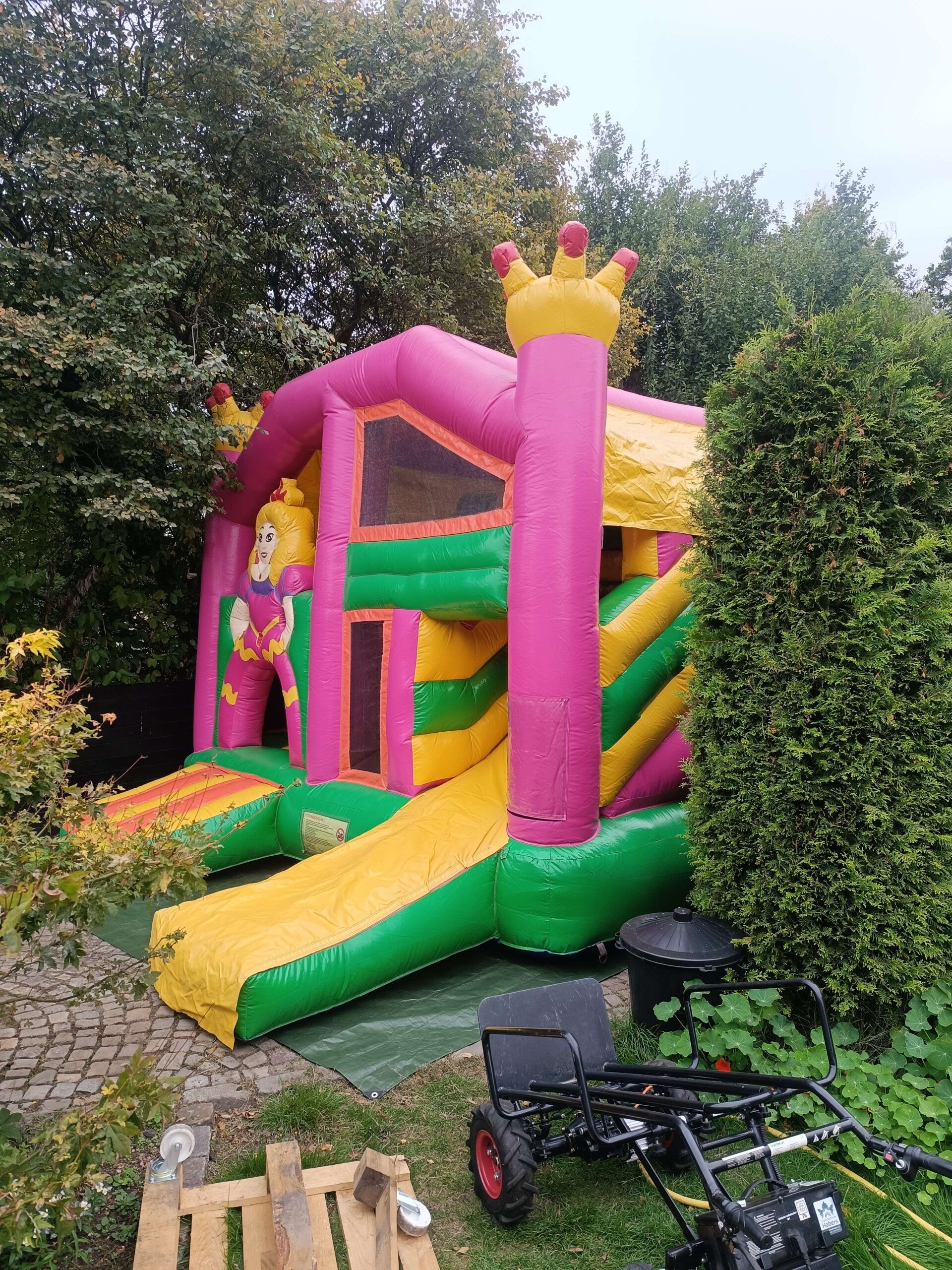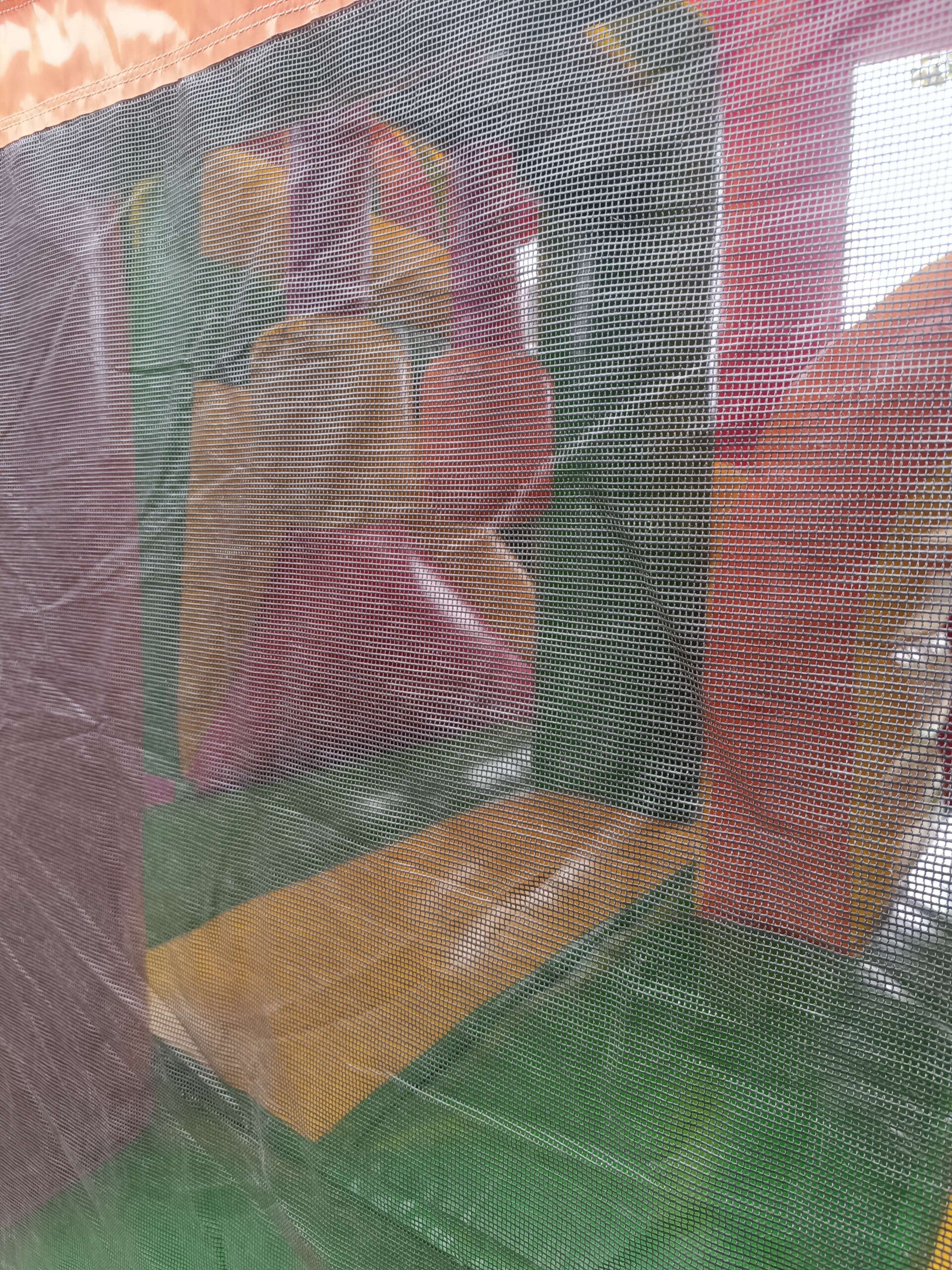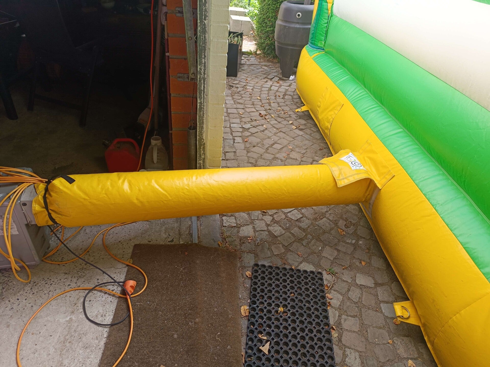 Dit Multiplay springkasteel heeft al aardig wat jaartjes meegemaakt. . Hij blaast niet meer zo hard op als hij zou moeten. Wel heb ik de vangnetten allemaal terug op orde gebracht, en zullen kleine kinderen geen last ondervangen van de opblaaskracht.